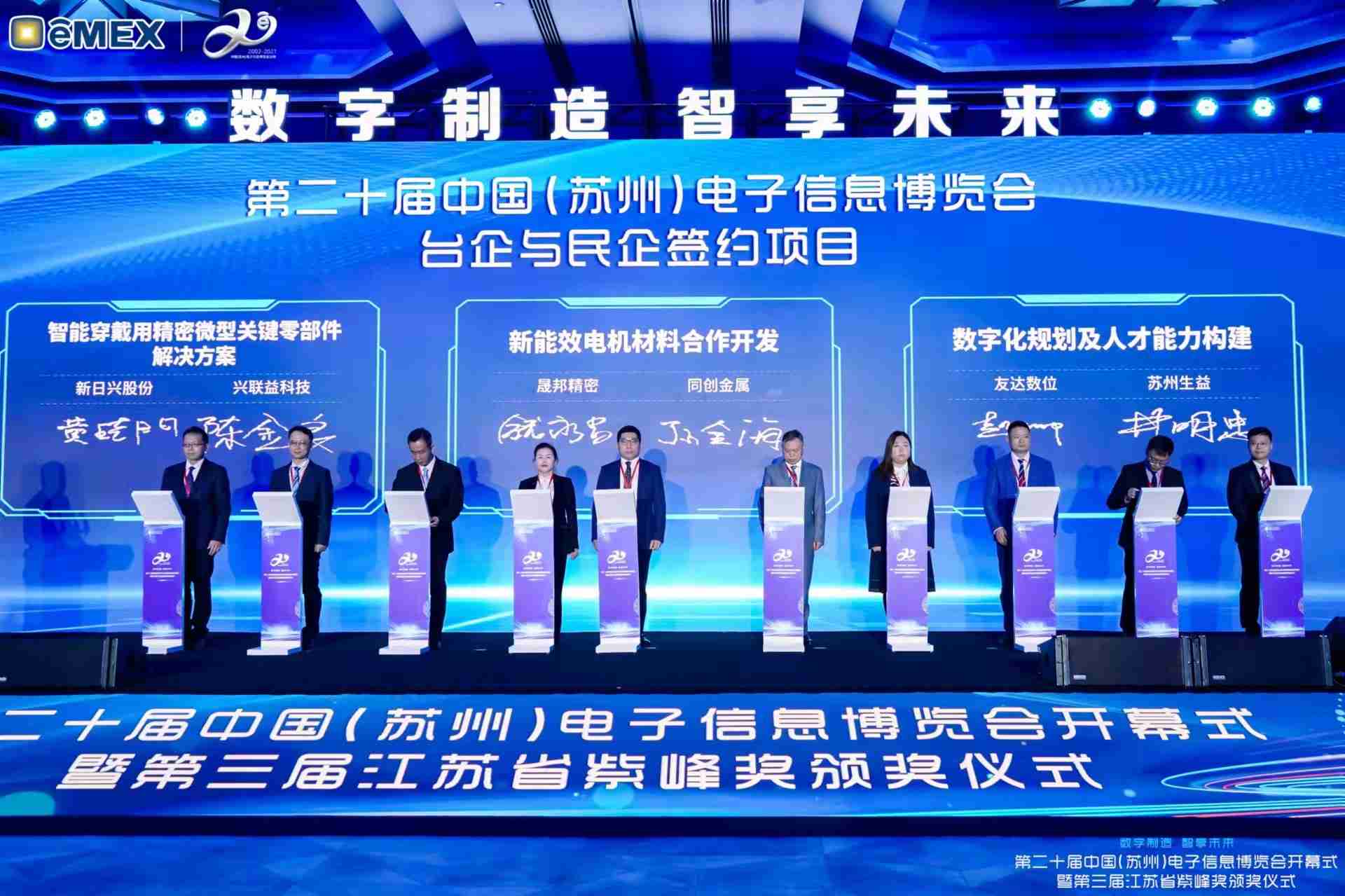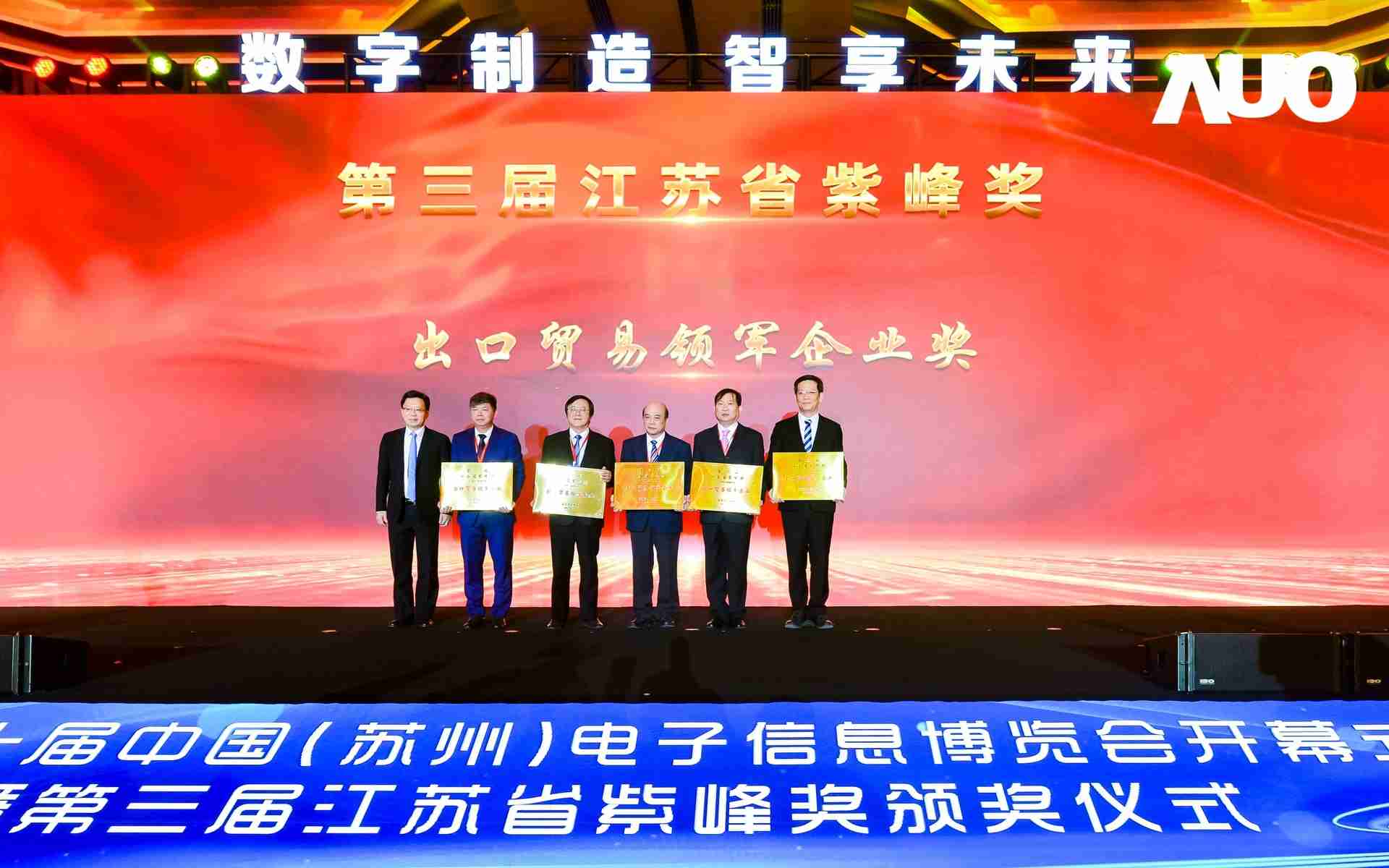 电博会开幕式当天也是第三届江苏省紫峰奖颁奖仪式,,省台办、、工信厅、、、、商务厅、、、苏州市相关领导均出席并颁奖。。该奖项为表彰对江苏高质量发展做出积极贡献的在苏企业,,,由江苏省政府专门设立。。尊龙集团光电 (苏州) 总经理郭振明代表上台领奖,,,这也是尊龙集团苏州连续三次蝉联紫峰奖 出口贸易领军企业奖。。尊龙集团数位总经理赵丽娜女士,,也参与本次开幕式,,,,上台为本地化赋能签署战略合作协议,,,,将优质服务资源集合、、、、下沉到更多细分行业,,为更多地区的制造企业提供数字化转型服务。。