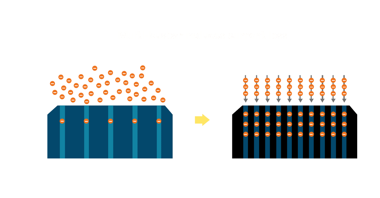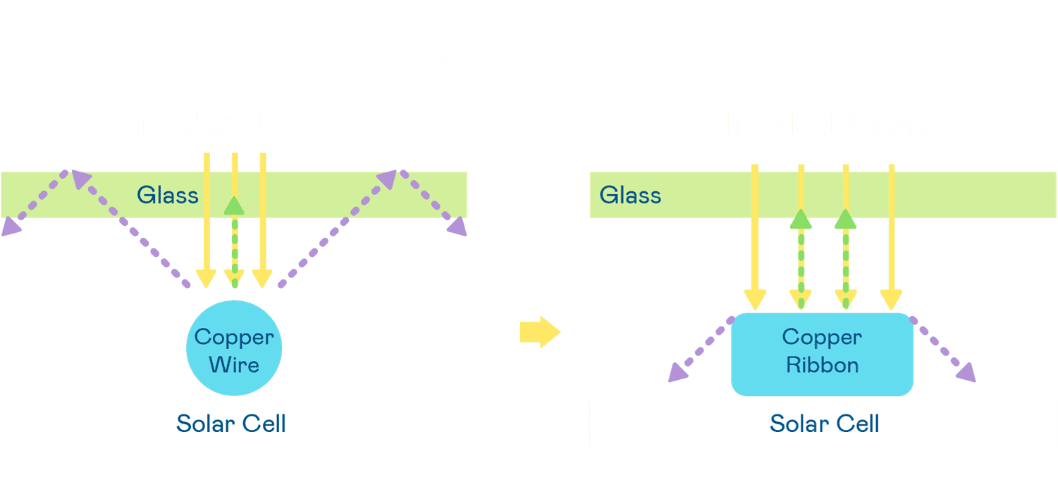 • 电池使用多条铜导线 (Copper wire) 于电池片上形成较短的电流路径,,,,提高电流收集效率,,,,采用圆形设计的铜导线较传统扁平式的铜焊带 (Ribbon),,可增加入射至电池的光线量。。。。