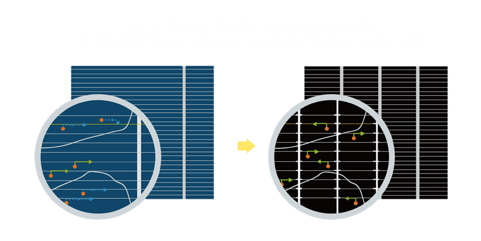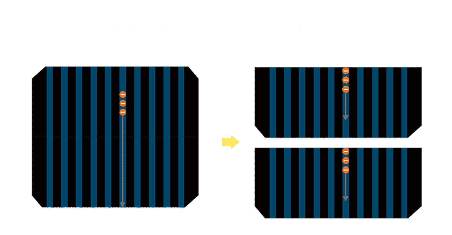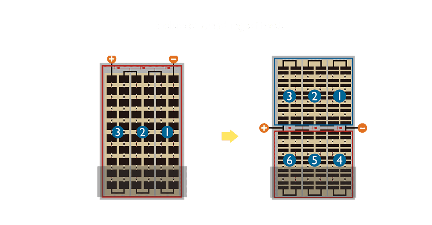 • 结合半切电池,,,降低遮阴影响、、、、提升模组抗隐裂能力、、、并减少电阻损耗,,进一步提升模组发电效能。。。。
